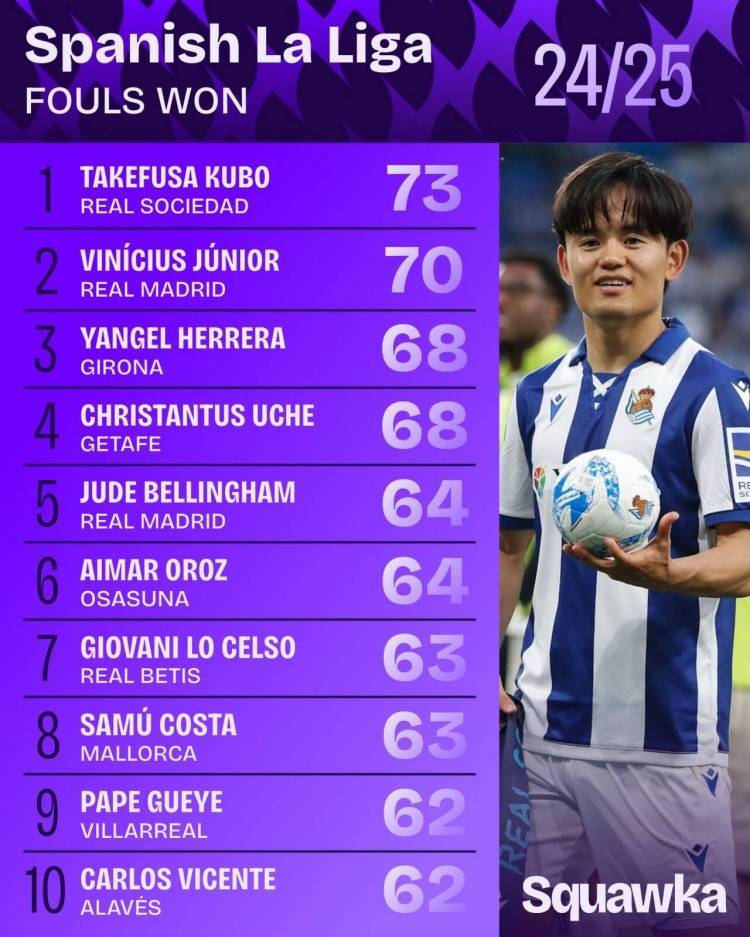 直播吧5月28日讯 数据平台Squawka今日公布了本赛季西甲联赛被犯规次数榜,其中日本中场久保建英以73次被犯规居首,维尼修斯70次排名次席,贝林厄姆64次排在第5位。